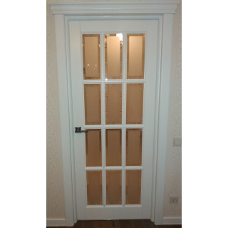 Дверное полотно из массива берёзы с остеклением, стекло с зеркальным рисунком. Комбинированный массив из березы + тонировка или окраска. Цена указана за полотно стандартных размеров. Изготовление возможно в 8 цветах тонировки, 5 цветах покраски, а также покраска в другие по каталогу RAL, нанесение патины. Стандартные размеры полотен 600/70..