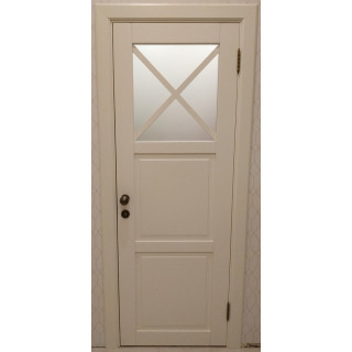 Дверное полотно модель Лофт1 ДГО, с верхним остеклением Сатин и Крест, цвет слоновая кость, покраска РАЛ 9010, рамочно-филенчатой конструкции из сосны, глухое, с частичным остеклением или со стеклом. Комбинированный массив сосны или березы. Базовый вариант - филенка из МДФ + окраска. Цена указана за полотно стандартных размеров. Изгото..